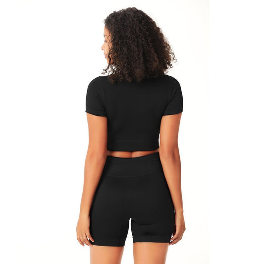Black 2 Piece Short Sleeve Zip Front Crop Top with Drawstring Cycling Shorts Co-Ord Set - Emily
