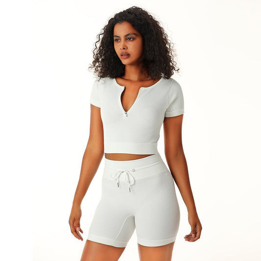 White 2 Piece Short Sleeve Zip Front Crop Top with Drawstring Cycling Shorts Co-Ord Set - Emily